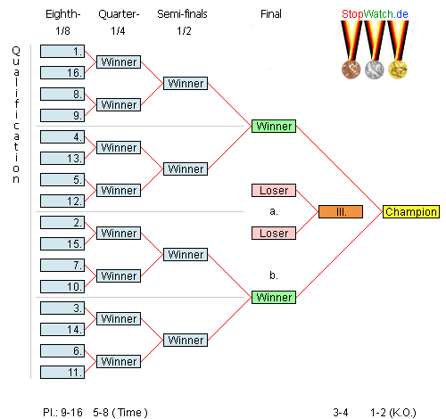 Die K.O. Begegnungen setzen sich nach dem Olympischen K.O. System zusammen (gleiches System, dass auch die K.O. Runde bei den Turnieren zusammensetzt. Siehe Zeichnung unten).